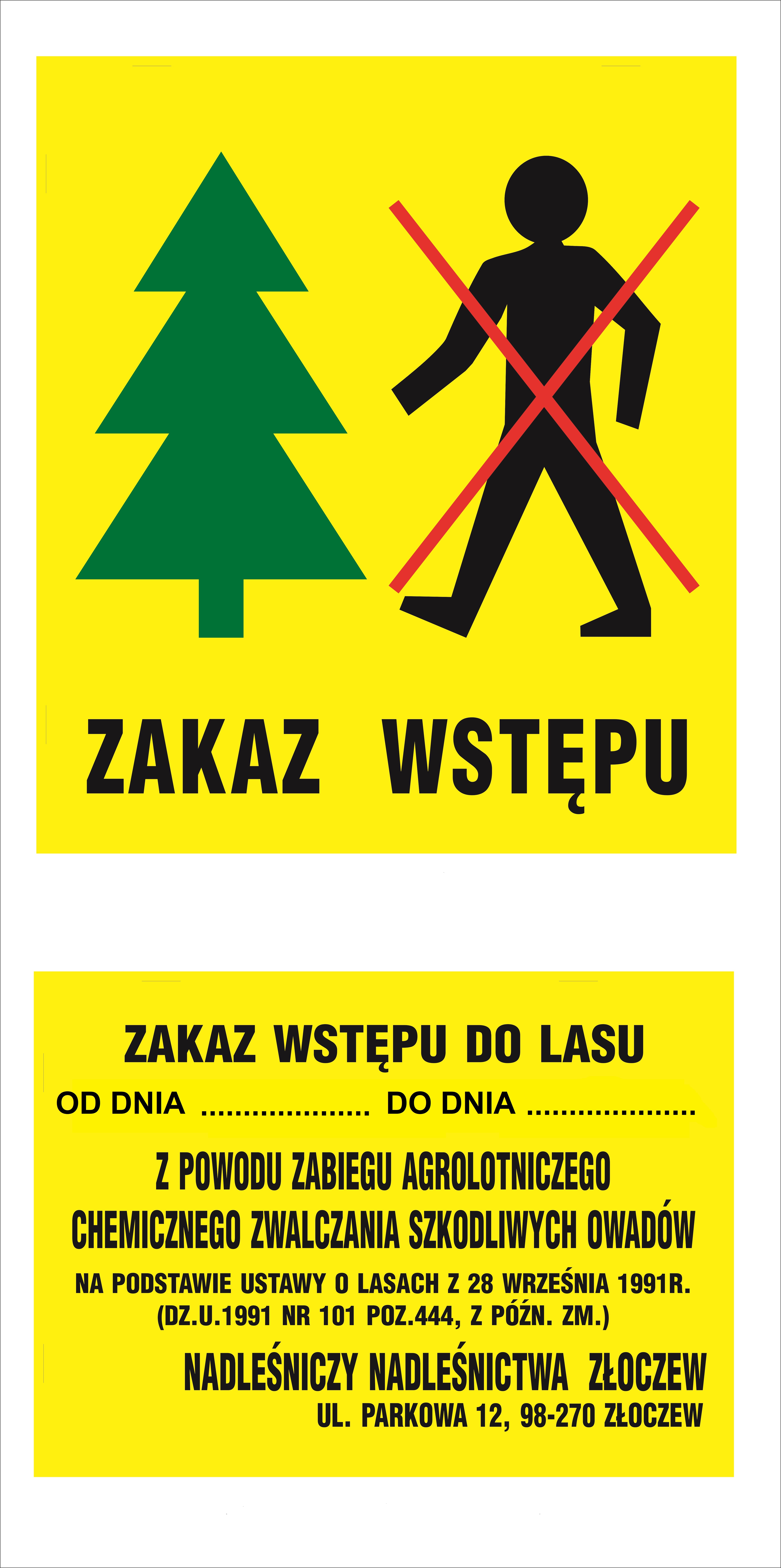 Ilości planowanych do zastosowania środków są zgodne z dawkami zawartymi w etykiecie. Szczegółową charakterystykę i sposób użycia obu ww. środków zawierają etykiety, stanowiące Załącznik nr 3 i 4 do niniejszego pisma. Na granicy lasu objętego zakazem wstępu, a w szczególności przy drogach i przejściach prowadzących do lasu, zostaną przez nadleśnictwo wywieszone tablice ostrzegawcze, zgodne z wzorem, stanowiącym Załącznik nr 5 do niniejszego pisma. Jednocześnie Nadleśnictwo Złoczew zwraca się z prośbą do Urzędów Gmin i innych organizacji o włączenie się do akcji informacyjnej w odniesieniu do miejscowej ludności.