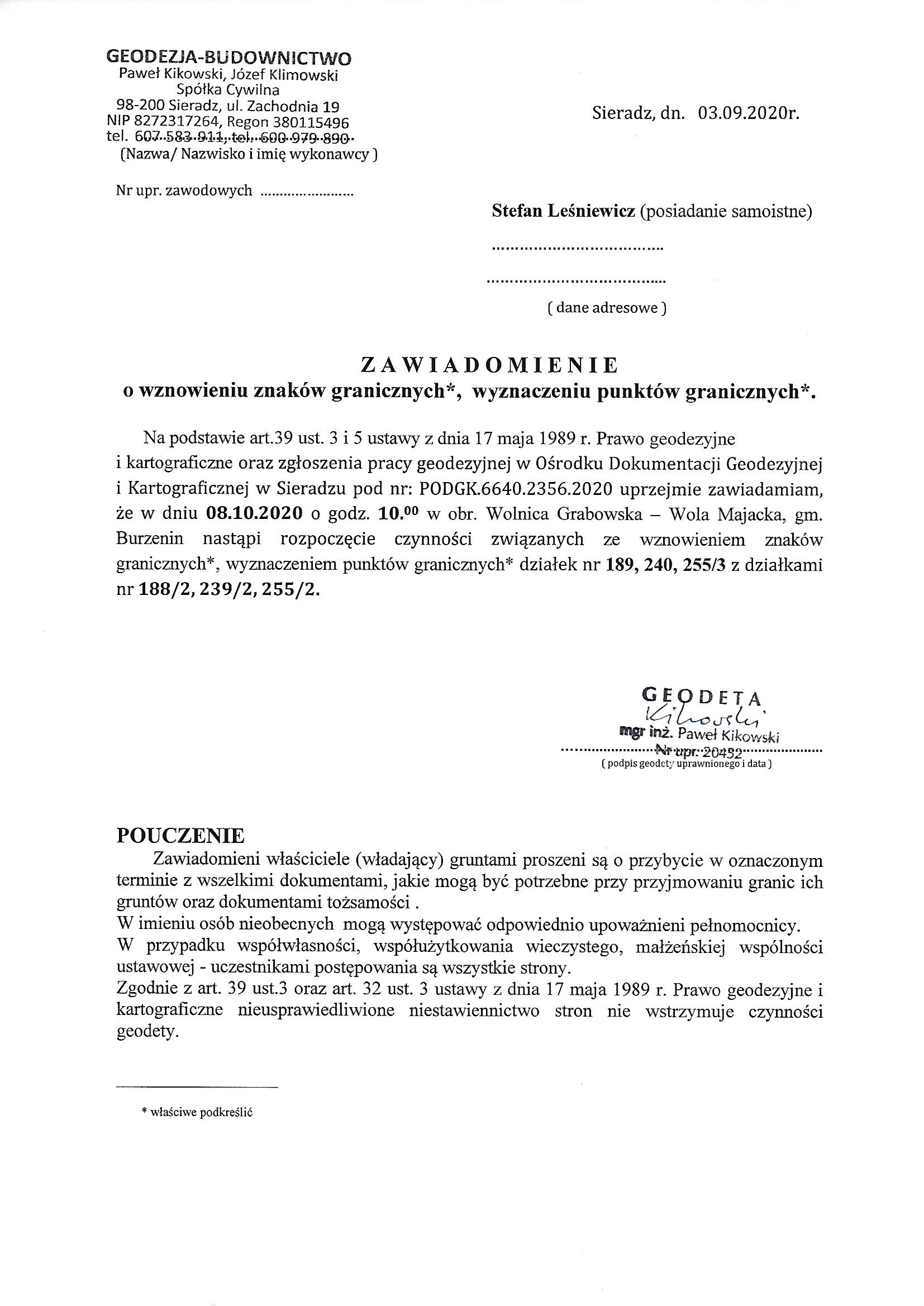 Na podstawie art.39 ust. 3 i 5 ustawy z dnia 17 maja 1989 r. Prawo geodezyjne i kartograficzne oraz zgłoszenia pracy geodezyjnej w Ośrodku Dokumentacji Geodezyjnej i Kartograficznej w Sieradzu pod nr: PODGK.6640.2356.2020 uprzejmie zawiadamiam, że w dniu 08.10.2020 o godz. 10.00 w obr. Wolnica Grabowska – Wola Majacka, gm. Burzenin nastąpi rozpoczęcie czynności związanych ze wznowieniem znaków granicznych*, wyznaczeniem punktów granicznych* działek nr 189, 240, 255/3 z działkami nr 188/2, 239/2, 255/2.