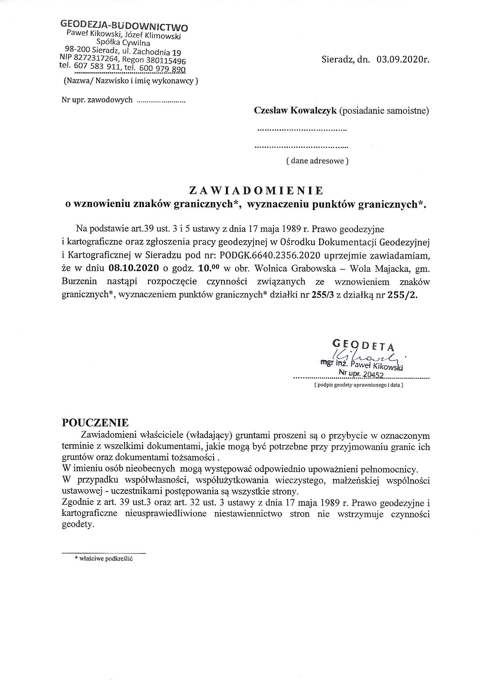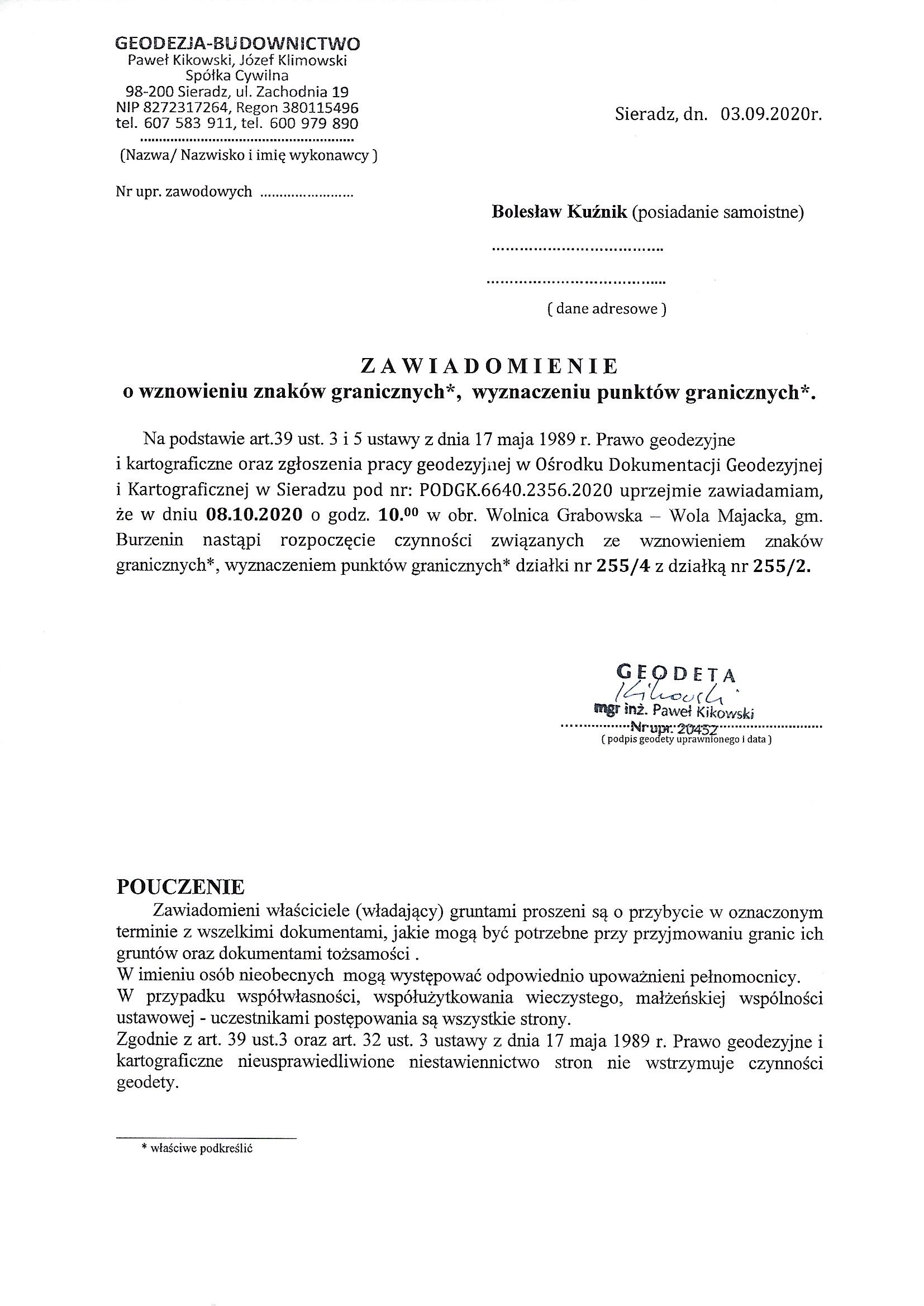 Na podstawie art.39 ust. 3 i 5 ustawy z dnia 17 maja 1989 r. Prawo geodezyjne i kartograficzne oraz zgłoszenia pracy geodezyjnej w Ośrodku Dokumentacji Geodezyjnej i Kartograficznej w Sieradzu pod nr: PODGK.6640.2356.2020 uprzejmie zawiadamiam, że w dniu 08.10.2020 o godz. 10.00 w obr. Wolnica Grabowska – Wola Majacka, gm. Burzenin nastąpi rozpoczęcie czynności związanych ze wznowieniem znaków granicznych*, wyznaczeniem punktów granicznych* działki nr 255/3 z działką nr 255/2.